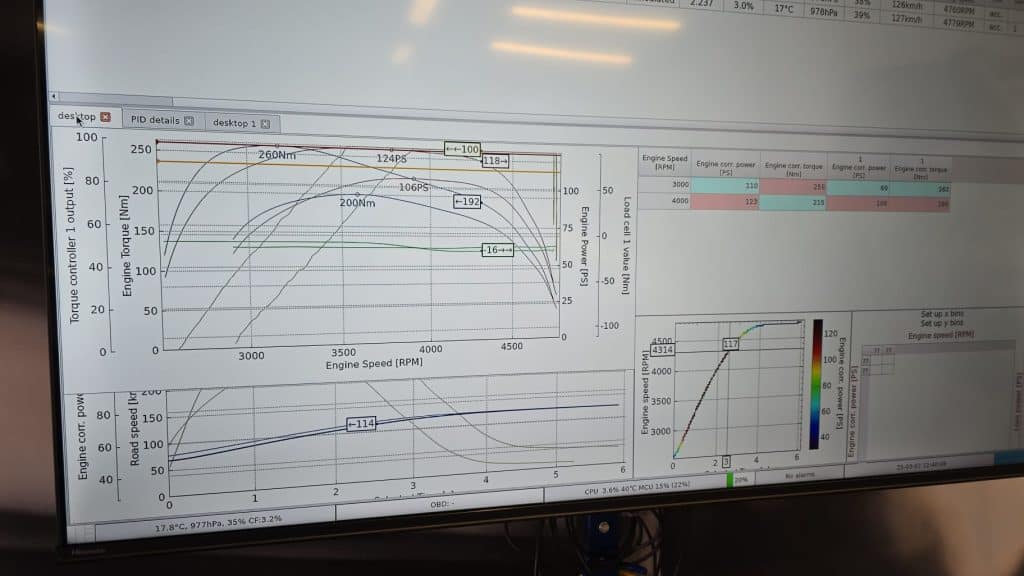 Auto trafiło do nas na hamownię obciążeniową, gdzie sprawdziliśmy jego stan i przeprowadziliśmy indywidualne strojenie sterownika silnika. Dzięki temu udało się uzyskać lepszą reakcję na gaz, większą elastyczność oraz wyraźnie poprawione osiągi.